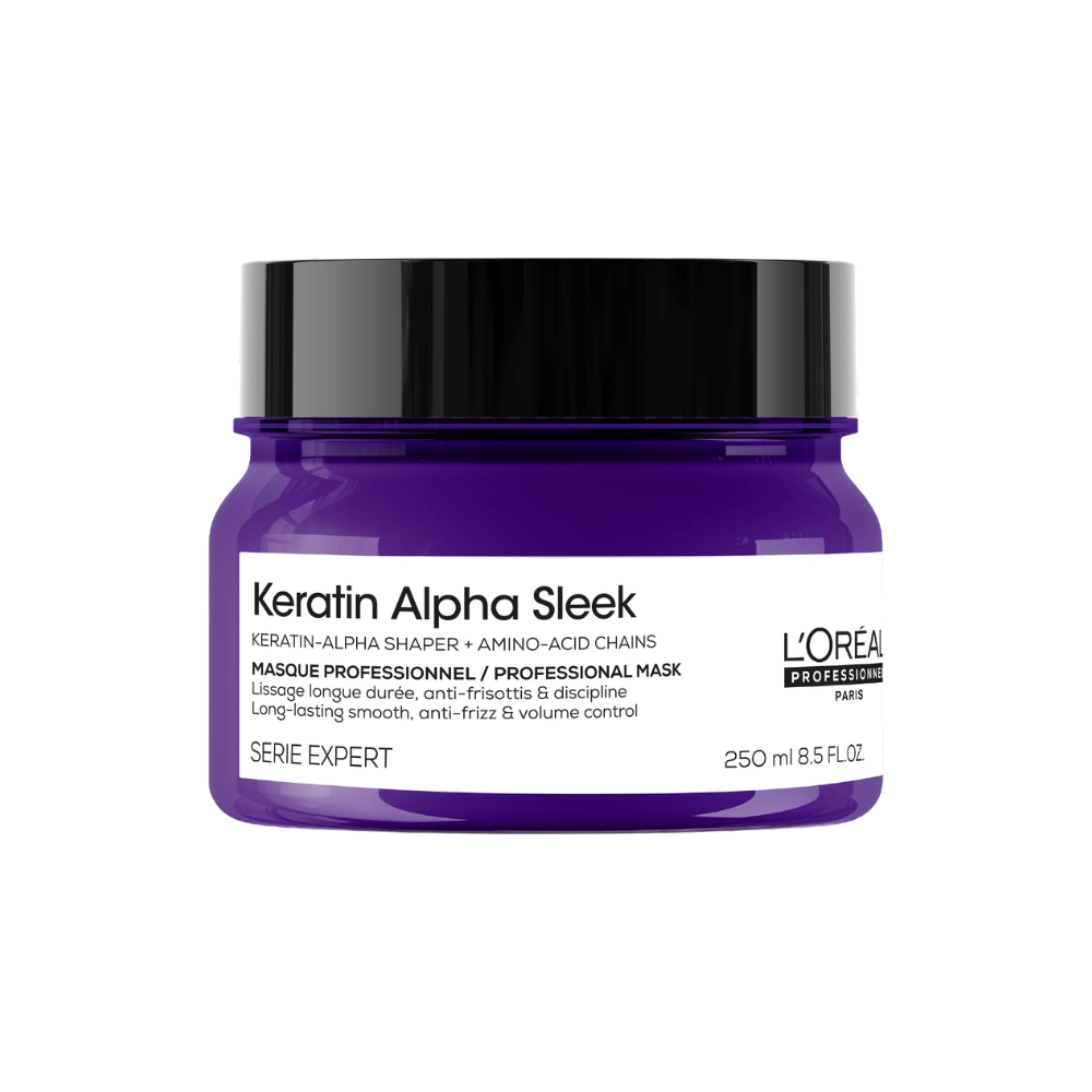 L’Oréal Professionnel Serie Expert Keratin Alpha Sleek Professional Hair Mask is a smoothing treatment designed to control frizz, protect against humidity and improve manageability in unruly hair. Enriched with Keratin Amino-Acid Technology, the formula helps restore the hair fibre surface while delivering long-lasting smoothness and shine.